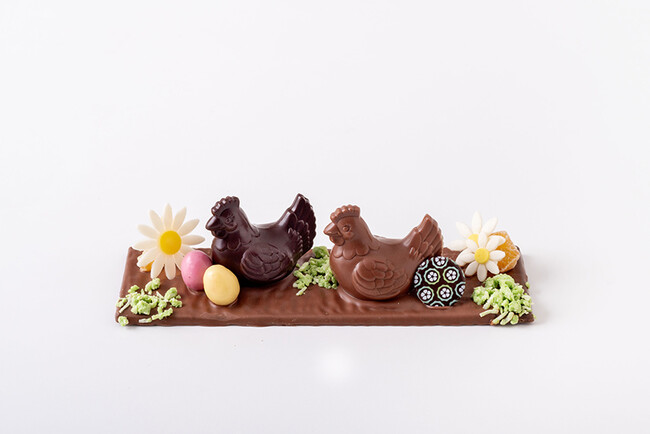 にわとりの庭をイメージしたビターとミルクのにわとり2匹。にわとりにはキャラメルのパールクラッカンとカラフルエッグが入っています。
