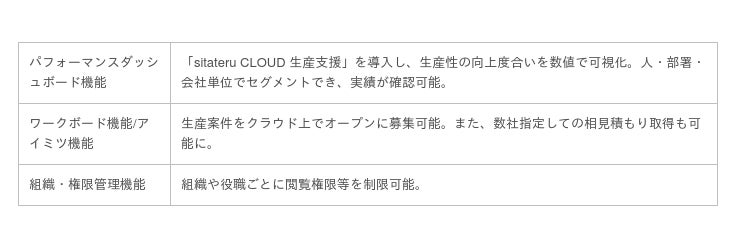 「sitateru CLOUD 生産支援」の主な機能一覧(2021年4月時点)