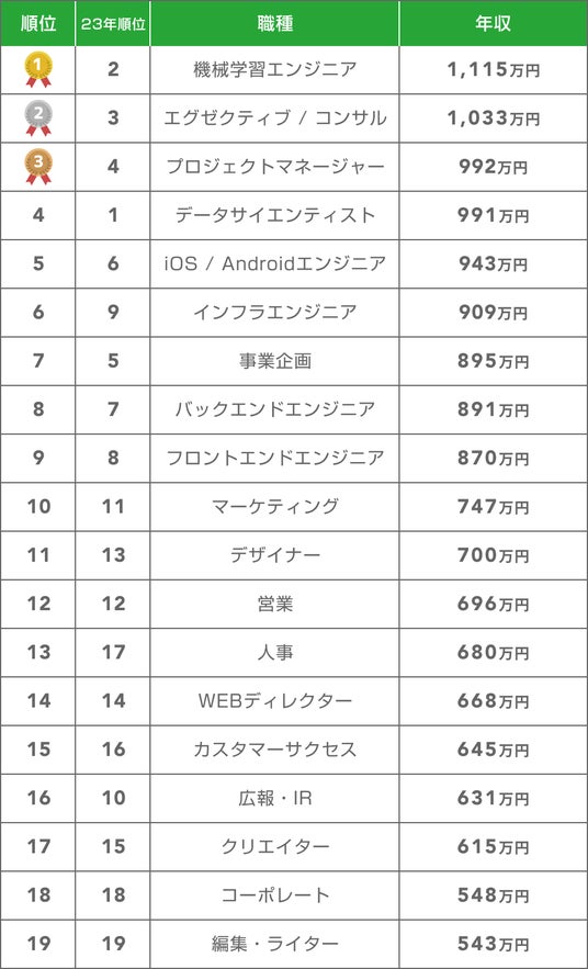 ・10位以内の非エンジニア職種は、「エグゼクティブ/コンサル、プロジェクトマネージャー、事業企画」と、戦略立案やプロジェクトマネジメント関連の3職種と「マーケティング」がランクイン