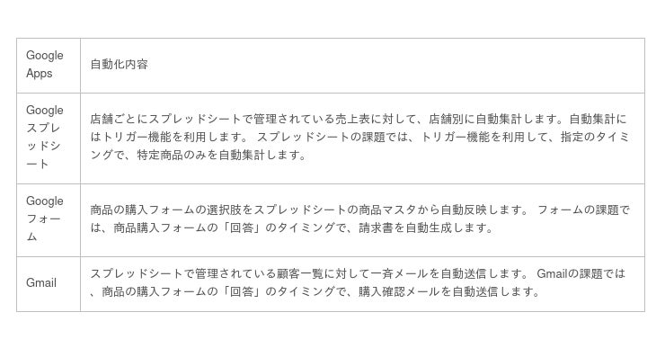 また、新教材『Google App Scriptで業務を自動化しよう』では、GASを使った自動化についてを理解しながら、Googleが提供しているサービス(Google Apps)の中でも特にGASが活用される『Googleスプレッドシート』『Googleフォーム』『Gmail』 を使った自動化を学習できます。