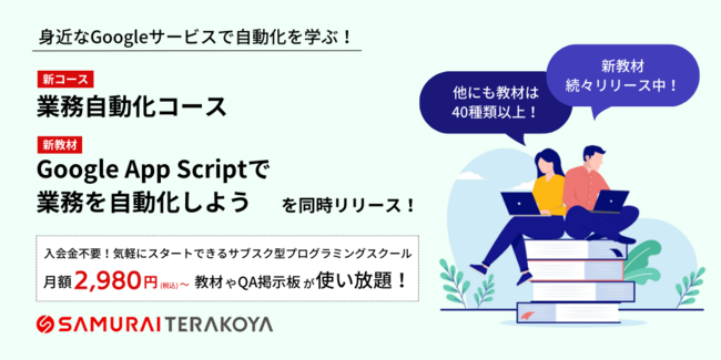 株式会社SAMURAI(本社所在地:東京都千代田区、代表取締役 :高比良 直人)は、運営するサブスクリプション型プログラミングスクール『侍テラコヤ』にて、新コース『業務自動化コース』、新教材『Google App Scriptで業務を自動化しよう』を同時リリースしました。