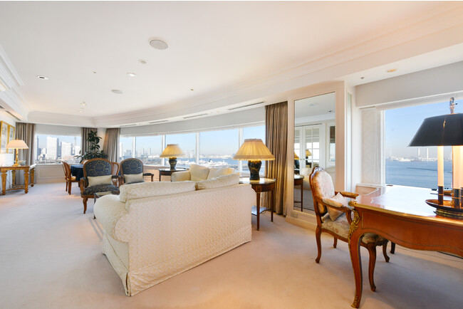 会場である「プレジデンシャルスイート」ルームはタワー館17階に位置し、130平方メートル の広さを誇ります。横浜港や大さん橋を一望できることから、船を眺めながら今後のクルーズ運航や協力内容について話し合い、なごやかな調印式が実現しました。