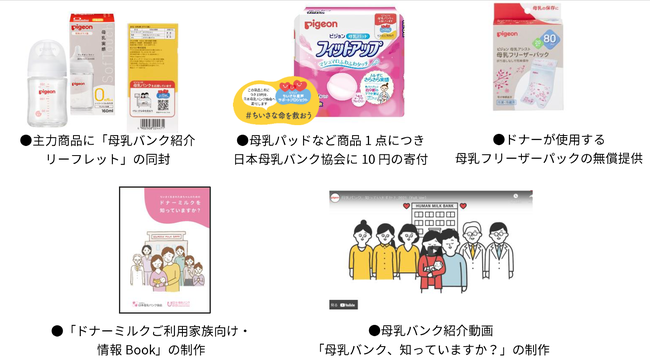 ピジョンは2020年から日本母乳バンク協会のゴールドスポンサーとして支援を開始、同年9月には、当時国内2拠点目となる母乳バンク「日本橋 母乳バンク」(運営:日本母乳バンク協会)を、当社の全面サポートによりピジョン本社1階に開設しました。また、当社の独自の強みである、ママ・パパ、プレママ・プレパパとの接点を活かし、国内シェア8割以上の商品パッケージに母乳バンクの情報を記載した他、母乳パットの売上の一部を同協会に寄付するキャンペーンを実施。さらに、社会への母乳バンクの普及およびドナーミルク利用の抵抗感を低減するため、普及啓発動画の作成や、情報Bookの無償提供などを行っています。