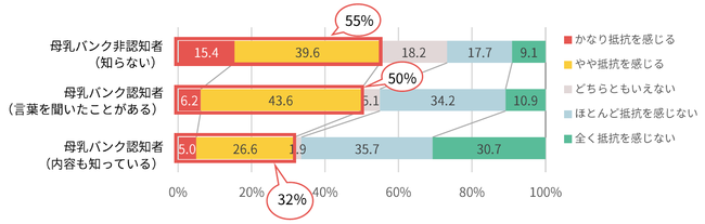 母乳バンクを「知らない」と答えた方の中では、ドナーミルクの利用に「抵抗感がある」と答えた割合は55%であったのに対し、母乳バンクの「言葉を聞いたことがある」と答えた方では50%、「内容も知っている」と答えた方では32%となり、母乳バンクへの理解度が高いほど、ドナーミルクへの抵抗感が低いことがわかりました。