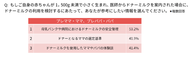 もしご自身の赤ちゃんが1,500g未満で小さく生まれ、医師からドナーミルクを案内された場合に、プレママ・ママ、プレパパ・パパともにドナーミルクの利用を判断する際に参考にしたい情報は、➊母乳バンクや病院における「ドナーミルクの安全管理」(53%)、➋「ドナーとなるママの選定基準」(42%)など、ドナーミルクがどこから来て、どう管理されているかに関する情報が上位2つに入りました。また、3番目には➌「ドナーミルクを使用したママやパパの体験談」(41%)が挙がってきました。