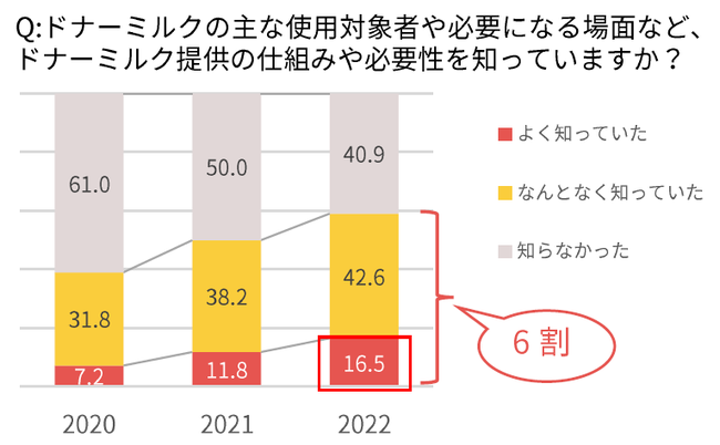 プレママ・ママでは、「どんな赤ちゃんを対象に、どんな場合にドナーミルクが必要となるか」について、「よく知っていた」と「なんとなく知っていた」と回答した人が約6割を占めました。(2020年の調査結果 39%)一方で、「よく知っていた」と回答した割合は、約17%程度にとどまっていることから、プレママやママに母乳バンクをより深く正しく理解してもらう必要があることが明らかになりました