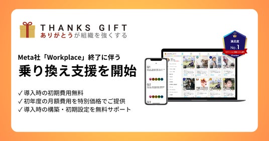 株式会社Take Action(本社:東京都品川区、代表取締役:成田靖也)が提供する組織改善プラットフォーム「THANKS GIFT」は、Meta社が提供するビジネスコミュニケーションプラットフォーム「Workplace」のサービス終了に伴い、Workplace利用企業様へ向けた乗り換えサポートプランの提供を開始いたします。