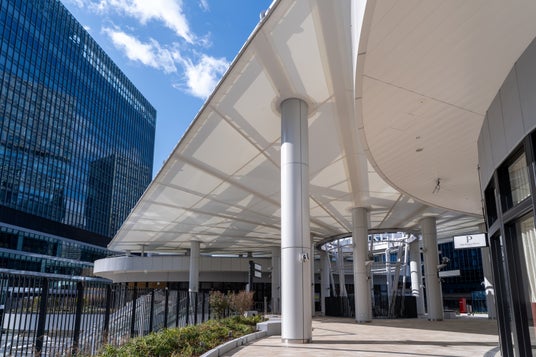 白い膜屋根は、四フッ化エチレン樹脂コーティング膜(PTFE膜)*1を採用しており、表面処理の酸化チタン光触媒*2の性能により、有機汚れが分解され雨水で洗い流されることで、白い外観が長期にわたり保たれる高い防汚性が特徴です。自然と調和した街づくりを推進するうめきたグリーンプレイスにおいて、今回完成した膜屋根は景観に溶け込むデザインで、訪れる人々に快適で美しい空間を提供します。