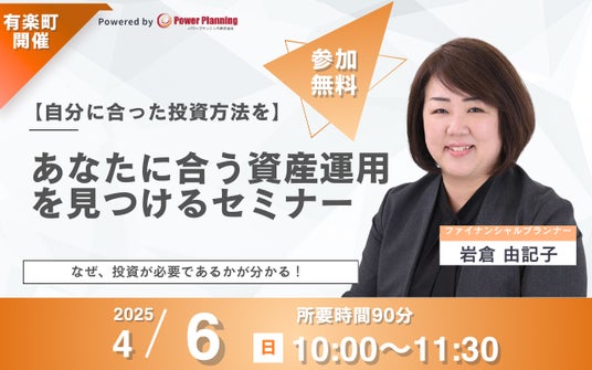 4月6日(日)10時より人気講師、岩倉 由記子氏による「あなたに合う資産運用を見つけるセミナー」を開催いたします。