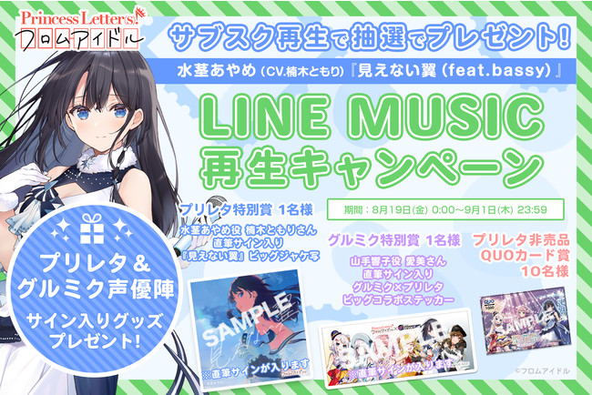 8月19日(金)24:00までの間に、「LINE MUSIC」上のランキング「ミュージックビデオ Top 100」で10位以内に入った場合は、応募者より抽選で各1名様に水茎あやめ役「楠木ともり」さん直筆サイン入り『見えない翼(feat.bassy)』ビッグジャケ写または、山手響子役「愛美」さん直筆サイン入り「グルミク×プリレタ」ビッグコラボステッカーをプレゼント!