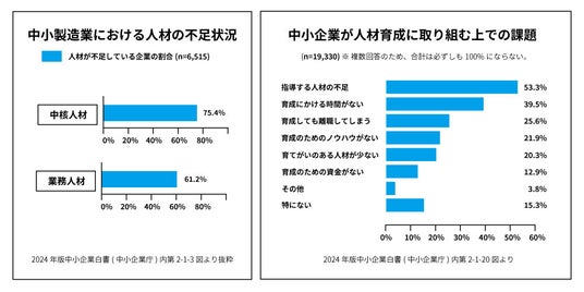 2024年版中小企業白書によれば、75.4%の中小製造業様で中核人材(事実上のさまざまな業務において中核を担う人材)が不足しており、人材育成においても「指導者の不足」と「育成時間の不足」が中小企業全体で大きな課題となっています。