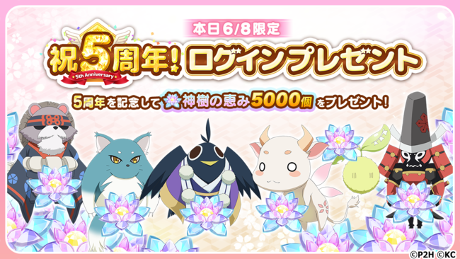 更に、5周年当日の2022年6月8日(水)0:00~ 23:59にログインすると、なんと!「神樹の恵み5,000個」をプレゼント!!この機会を是非お見逃しなく!!