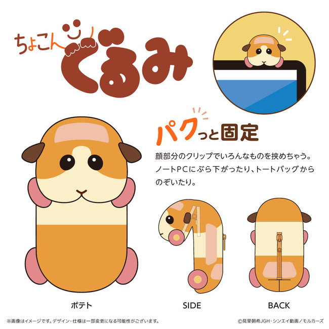 「ちょこんぐるみ」シリーズ第二弾は、顔部分のクリップで様々なものに挟んでぶらさげることができるぬいぐるみ「ちょこんぐるみ ポーチ」、第三弾商品はぬいぐるみとシュシュが一体化した「ちょこんぐるみ シュシュ」です。新商品初のキャラクターとして、「PUI PUIモルカー」の愛くるしい表情が特徴的な、ポテトとシロモのデザインを取り揃えました。