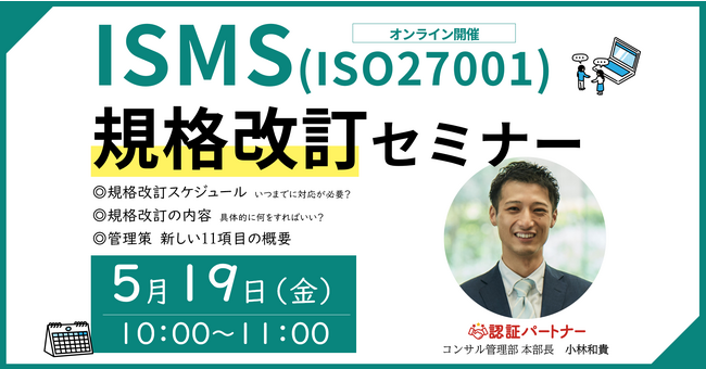 ISO・Pマーク支援実績数全国No.1※のISO/Pマークの取得・運用支援サービス「認証パートナー」を提供する株式会社スリーエーコンサルティング(本社:大阪府大阪市、代表取締役社長:竹嶋 寛人)は、5月19日(金)10:00-11:00「ISMS(ISO27001)規格改訂 無料オンラインセミナー」を開催します。規格改訂で変わるポイントや対応するべき時期、管理策 新しい11項目の概要などをISMSのプロが分かりやすく解説いたします。有効期限によって対応すべき時期が異なるので、ぜひ自社の有効期限を確認いただいた上でご参加ください。2024年に有効期限を迎える方は特に注意が必要です。