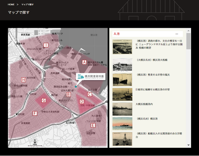 【A.港】 現在の山下公園、大桟橋から赤レンガ倉庫やハンマーヘッドのあたりを含みます。