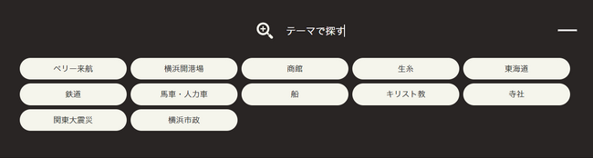 ペリー来航・横浜開港場・商館・生糸・東海道・鉄道・馬車・人力車・船・キリスト教・寺社・関東大震災・横浜市政の各テーマについてさまざまな種類の資料からご覧いただけます。