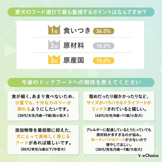 株式会社FoR/FoRINC.(本社:東京都渋谷区、代表取締役社長:高橋知暉)は、「みんなのかしこい選択がわかる」をビジョンに掲げるサイト「WeChoice」にて、日常の商品・サービス選びに役立つ情報を発信しています。今回は、20代以上の男女100人を対象に、「ドッグフード」についてのアンケート調査を実施しました(WeChoice調べ)。