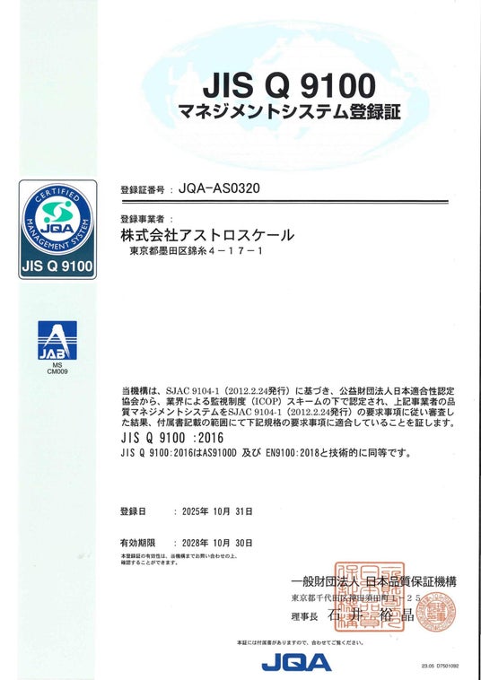 持続可能な宇宙環境を目指し、軌道上サービスに取り組む株式会社アストロスケールホールディングス(本社:東京都墨田区、創業者兼 CEO 岡田光信)の日本子会社である株式会社アストロスケール(本社:東京都墨田区、代表取締役社長 加藤英毅、以下「アストロスケール」)はこの度、航空宇宙・防衛産業に特化した品質マネジメントシステムの国際規格であるJIS Q 9100の認証を取得したことをお知らせいたします。
