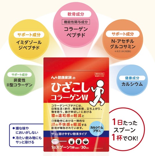 『ひざこしコラーゲンW』で、健康家族があなたの一歩を応援します。