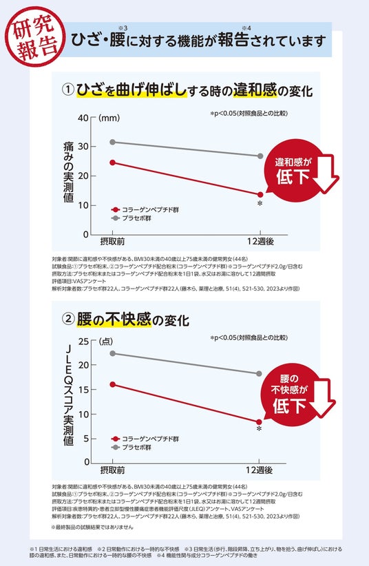 ※コラーゲンペプチド(機能性関与成分)、N-アセチルグルコサミン、非変性II型コラーゲン、イミダゾールジペプチド、カルシウムを配合した、膝の違和感・腰の不快感を軽減できる日本初の機能性表示食品