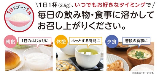 健康食品は「続けられるかどうか」も大切。『ひざこしコラーゲンW』は、日常の中で習慣的に取り入れられるよう、無味無臭で、すぐに溶ける粉末タイプを採用しています。みそ汁やスープ、コーヒー、ヨーグルトなど、普段の食事や飲み物の味を変えることなく加えられるので、朝の1杯やおやつタイム、夕食時など、どんなタイミングでもストレスなく続けられます。冷たい飲み物にもサッと溶けるため、暑い季節にもぴったりです。