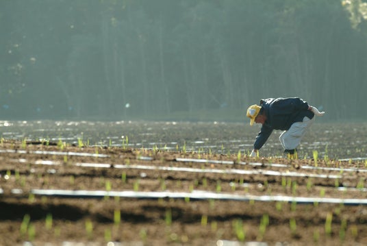 ▲にんにく畑での作業は、ひざと腰に負担がかかる