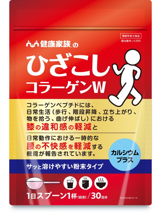 「伝統にんにく卵黄」でおなじみの株式会社健康家族(本社:鹿児島県鹿児島市平之町、代表取締役:藤 朋子)は、年齢とともに増えるひざ・腰の違和感にダブルで応える、機能性表示食品『ひざこしコラーゲンW』の販売を2025年7月中旬より開始しました。さらに、8月からは発売を記念した特別価格キャンペーンも開始。本商品は、日本初※となる「ひざ・腰の違和感を軽減する」機能性表示食品として開発されました。毎日続けやすい粉末タイプで、1日1杯、飲み物や食事に加えるだけの手軽さが魅力です。