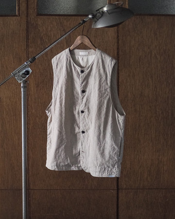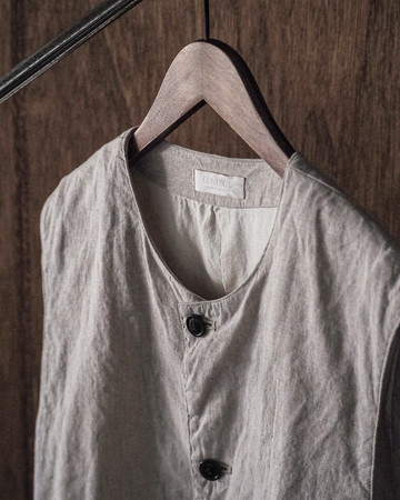 UpcycleLinoの生地にて初めて製作するクルーネックベスト。環境配慮に富んだ素材変更と共に、より着馴染みの良い形へとアップデート。小さな気づきから定番を見つめ直し、納得のバランスでご用意します。