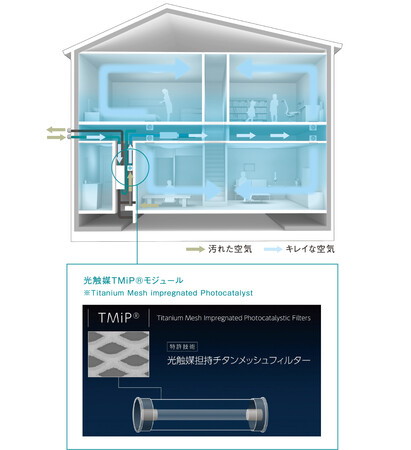 階間に集めた屋外空気・全館の空気は、光触媒担持チタンメッシュフィルターを採用した空間除菌脱臭機を通すことで、ウイルス・細菌なども光触媒技術で分解することが可能です。