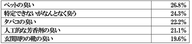 毎日生活する中で自宅の臭いには慣れてしまいやすいものです。しかし、他人の住まいに行った時はその住まい独特の臭いがすることもあります。今回の調査でも、他人の家に行って何らかの臭いが気になったとの回答が70.5%になりました。その臭いは、ペットの臭いが最も多く26.8%。続いて特定できないがなんとなく臭うと思った方が24.3%となりました。さらにタバコの臭い、人工的な芳香剤の臭い、玄関周りの靴の臭いなどが上位となっています。また、このような臭いが自宅でもしていないか心配になる方が8割以上となっており、普段は気付きにくい自宅の臭いに対して敏感になっていることが判明しました。