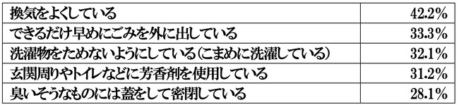 そのため、自宅の防臭対策としては、「換気をよくしている」(42.2%)が最も多くなっています。換気のために窓を開けるのが一般的ですが、光熱費が高騰する中、冷暖房費を抑えたい気持ちと相反することが気がかりです。さらに、生ごみの臭い対策として「できるだけ早めにごみを外に出す」(33.3%)、「臭いそうなものには蓋をして密閉している」(28.1%)、汗臭さ対策として「洗濯物をためないようにしている」(32.1%)、臭いやすい「玄関周りやトイレなどに芳香剤を使用している」(31.2%)と続いています。