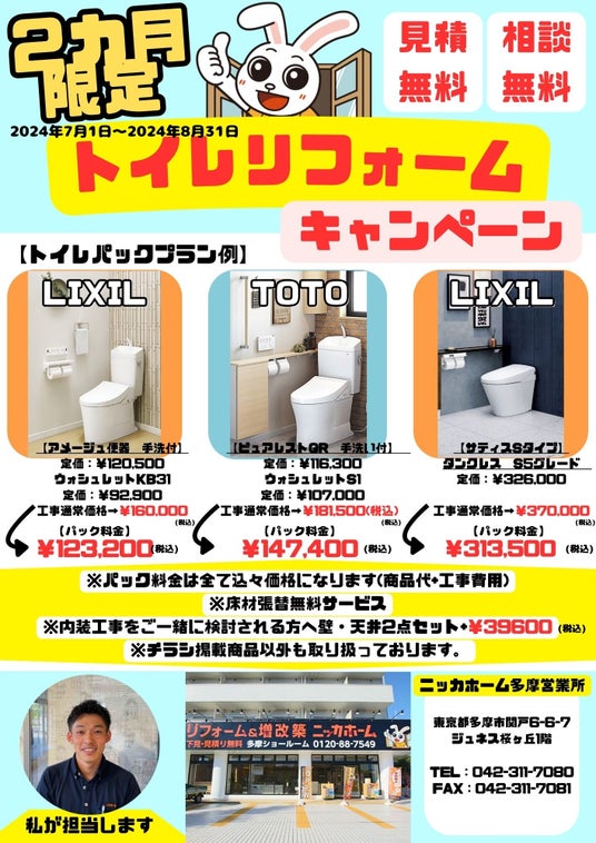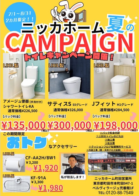 ”ニッカホーム夏のトイレキャンペーン”と題した、昨年大好評だった企画が今年は更にパワーアップ!7/1~8/31までの2か月間限定!八王子市・町田市・多摩市・調布市並びにその近隣にお住いの方、必見です!