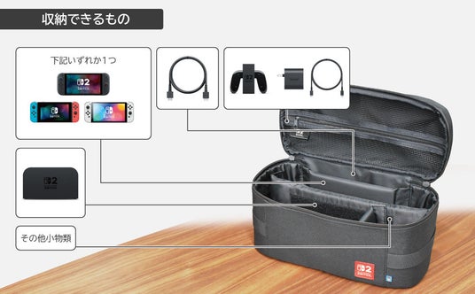 Nintendo Switch(TM) 2 本体や周辺機器を一式まるごと収納できるバッグです。