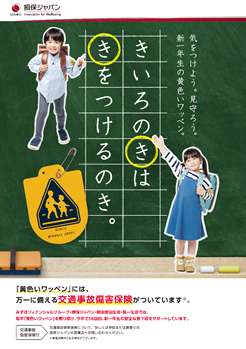 損害保険ジャパン、みずほフィナンシャルグループ、明治安田生命保険、第一生命保険の4社は、毎年、新小学一年生の交通安全を願い「黄色いワッペン」を贈呈しています。2022年度は、全国の新小学一年生に約110万枚の「黄色いワッペン」を贈呈しました。
