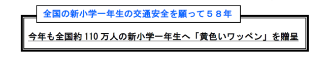 同事業は、学校に通い始める子どもたちが「黄色いワッペン」を身につけることで交通安全に関心を持ち、保護者やドライバーの方々の注意を喚起して、子どもたちの交通事故防止に役立てていただくことを願い、1965年に誕生しました。第1回から今年の第58回までの全国の贈呈枚数累計は約6,978万枚にのぼります。