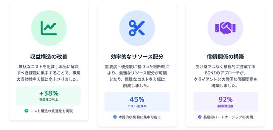 本事例では、データ分析と構造的な業務設計の見直しにより、運用コスト45%削減・収益性38%向上・顧客満足度92%という成果を達成しています。