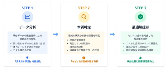 通話データと業務ログを詳細に分析し、現場の課題を「予算・スピード・優先度」の3軸で整理。判断基準の不統一や工程の重複を排除し、データに基づいた業務設計へと転換しました。
