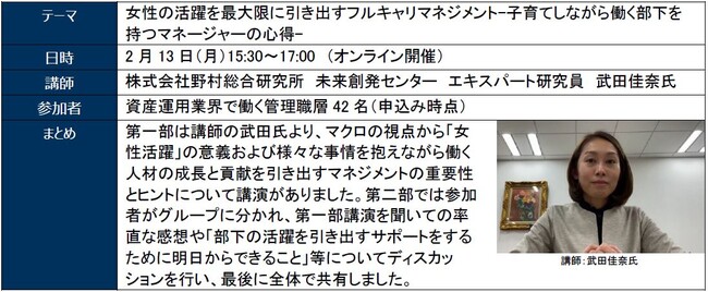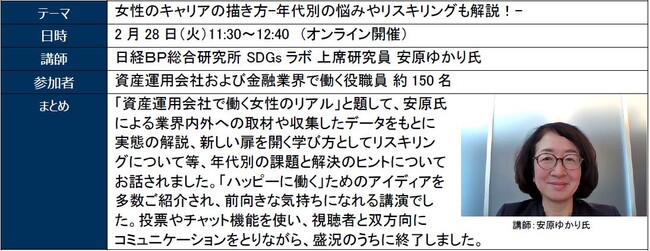 3月8日の国際女性デーを前に、2023年2月を「Asset Management Women’s Forum」月間と位置づけ、ジェンダーダイバーシティについて多様な角度から考える機会となるよう、当イベントを全3回のプログラムで開催しました。当日の内容については、以下の通りです。