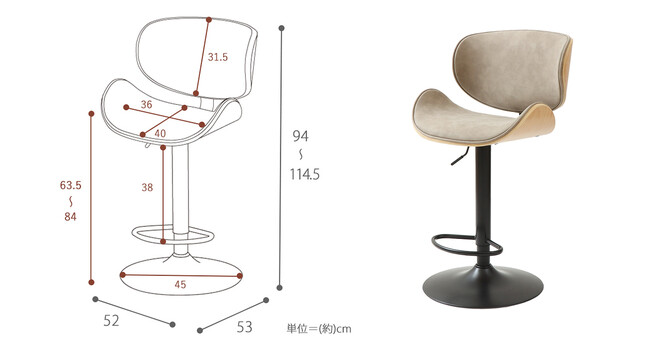 サ イ ズ :本体(約)幅52×奥行53×高さ94~114.5cm 座面高(約)約63.5~84cm