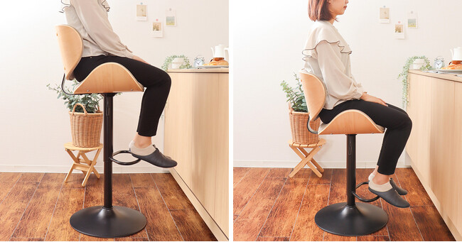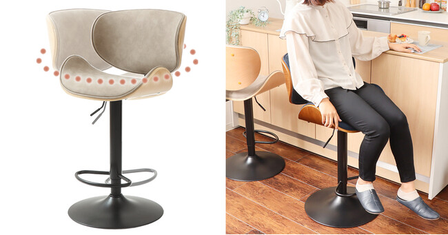 家具の企画、製造、販売を行う株式会社ヤマソロ(本社:兵庫県小野市、代表取締役社長:山本 一郎)が運営するネット通販『ヤマソロ公式ECショップ』は、プライウッドならではの美しい曲線が目を引くチェアSmil(スミール)シリーズから新たに、バーチェアSmil-salute-(スミール-サルーテ-)を発売しました。シェルのような形状のシートはしっかりとした背もたれがあり、長時間座っても疲れにくく、座り心地はバツグン。座面下のレバー1つで昇降し、座面の高さは63.5~84cmの範囲で調整が可能。ミドルカウンターからハイカウンターまで幅広く対応できます。足置きにもなるステップリングは、座面の昇降に合わせ動くので、高い位置での上り下りも安心です。