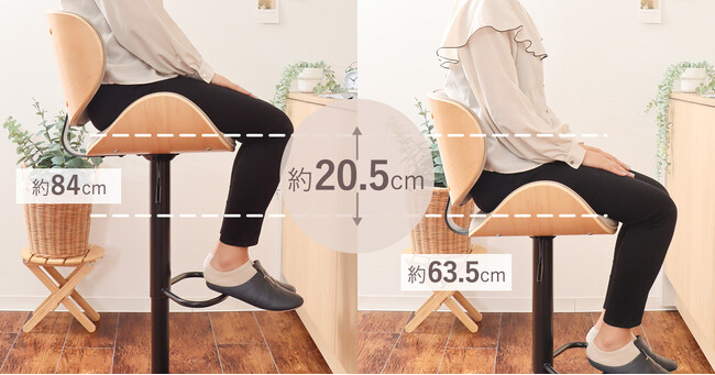 座面下にあるレバーで簡単に高さ調節が可能です。座面高が約62.5~83cm(可動幅約20.5cm)の間で調節でき、ミドルカウンターからハイカウンターまで幅広い高さのカウンターに対応します。