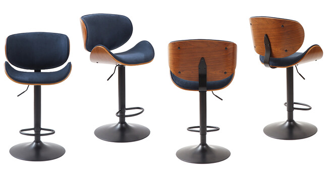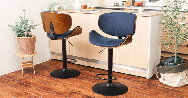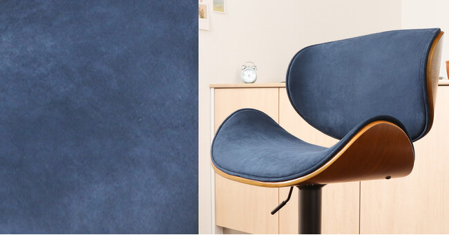 ネイビーxブラウン・・・落ち着きのある綺麗なネイビーカラーがお部屋の挿し色になります。生地は角度によって表情が変わるスエード調ポリエステル素材を使用。撥水性があります。こっくりとしたブラウンの木部と黒いスチール脚とのクールなコンビネーションがカウンターキッチンをぐっと引き締めてくれそう。
