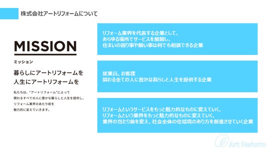 創業70年、年間6500件以上のリフォームを施工し、関東、関西、東海、九州に展開するアートリフォーム。大手不動産仲介会社各社のパートナーとなり、中古物件購入時のリフォームを手掛けるBtoB事業、WEBや折込チラシからの反響顧客に対するリフォーム提案のBtoC事業を展開。利用者数No.1のリフォーム会社サイト「ホームプロ」においては13年連続でリフォーム完了件数西日本第一位、2022年度は完了金額西日本第一位の表彰を受けている。また、2022年度の売上ランキングでは西日本の総合リフォーム店で1位となり、ビジョンである『業界の先頭集団』に向けて成長を続けている。