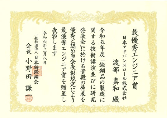 今回の講演会出場は、日本鋳鍛鋼会 鍛鋼・製鋼研究部会における今年度の数ある事例発表の中から部会主査より推薦を受けたものであり、更に日本鋳鍛鋼会の鍛鋼・製鋼研究部会、鍛鋼研究部会、機械加工部会からそれぞれ選ばれた優秀発表の中から選ばれたものが最優秀エンジニア賞となる、非常に栄えある賞です。