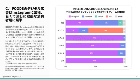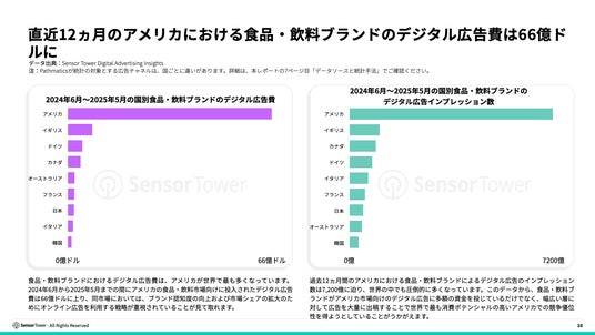 2024年6月から2025年5月までのアメリカにおける食品・飲料関連のデジタル広告費は66億ドルに達し、インプレッション数は7,200億に迫っています。アメリカは世界で最も消費力が高い国であることから、APAC地域のブランドによる国外向け広告出稿における一番の要地になっています。サントリー、CJ FOODSなどの企業もアメリカ向けの予算を増してブランド認知度および市場シェアの向上を図っています。