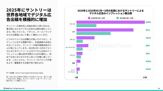 アメリカは消費力が高いだけでなく、スピリッツに対する需要が多く、利益貢献の余地も大きいことから、サントリーの海外事業成長のけん引役になっています。2025年1月から5月までのアメリカにおけるサントリーによるデジタル広告のインプレッション数は前年同期から244%増加し、初めて日本におけるそれを上回って30億に達しています。このことから、サントリーのアメリカ市場をよりいっそう重視する決意が見て取れます。