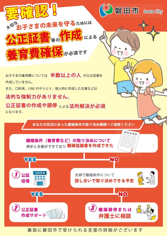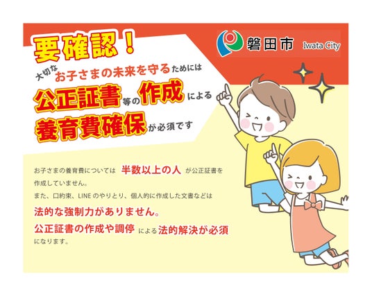 磐田市(静岡県)は、「逆プロポ※」により、株式会社チャイルドサポートと共創で作成した養育費確保に向けた取決めの必要性を周知するためのチラシを、2025年4月から配布します。