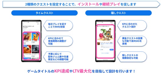 「タイムクエスト」「隠しクエスト」の2種類のクエストを設定することで、インストールや継続プレイを促します。毎日プレイを促すことでRRを担保したり、KPIに合わせたクエスト設計をすることで、高いROASも実現させており、ゲームタイトルのKPI達成やLTV最大化を目指して設計を行います。現時点ではCPI(インストール課金)を中心に対応しています。