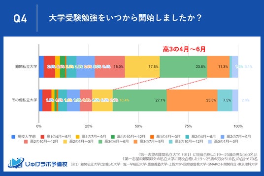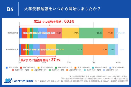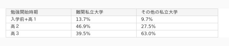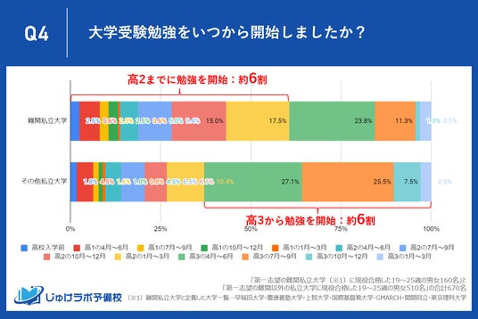 難関私立大学合格者は約6割が高2までに、その他私立大学合格者は約6割が高3から受験勉強を開始していることが判明
