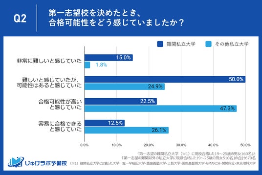 加えて、難関私立大学合格者の中で65%が合格を「非常に難しい」と感じていたり、「難しいが可能性はある」と感じており、その他の私立大学合格者と比較してもその差は2倍以上になっています。これは、難関私立大学を目指す学生がより高い目標を設定し、それに向けての覚悟を持って挑戦していることを示唆しています。